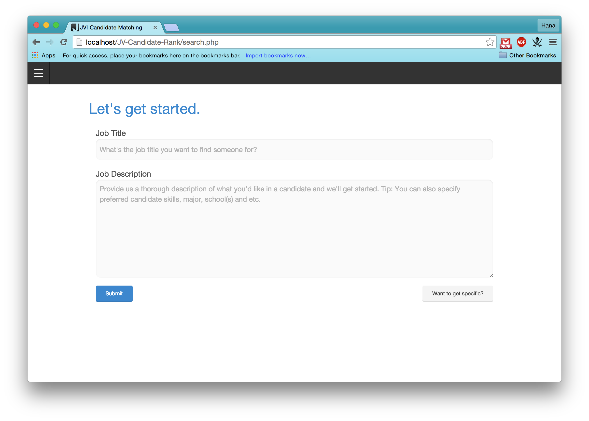 First, the recruiter enters the job title and job description in the fields shown to the right. After pressing submit, a parser identifies keywords that indicate what the recruiter is looking for (i.e. location, work status, skills, etc.).