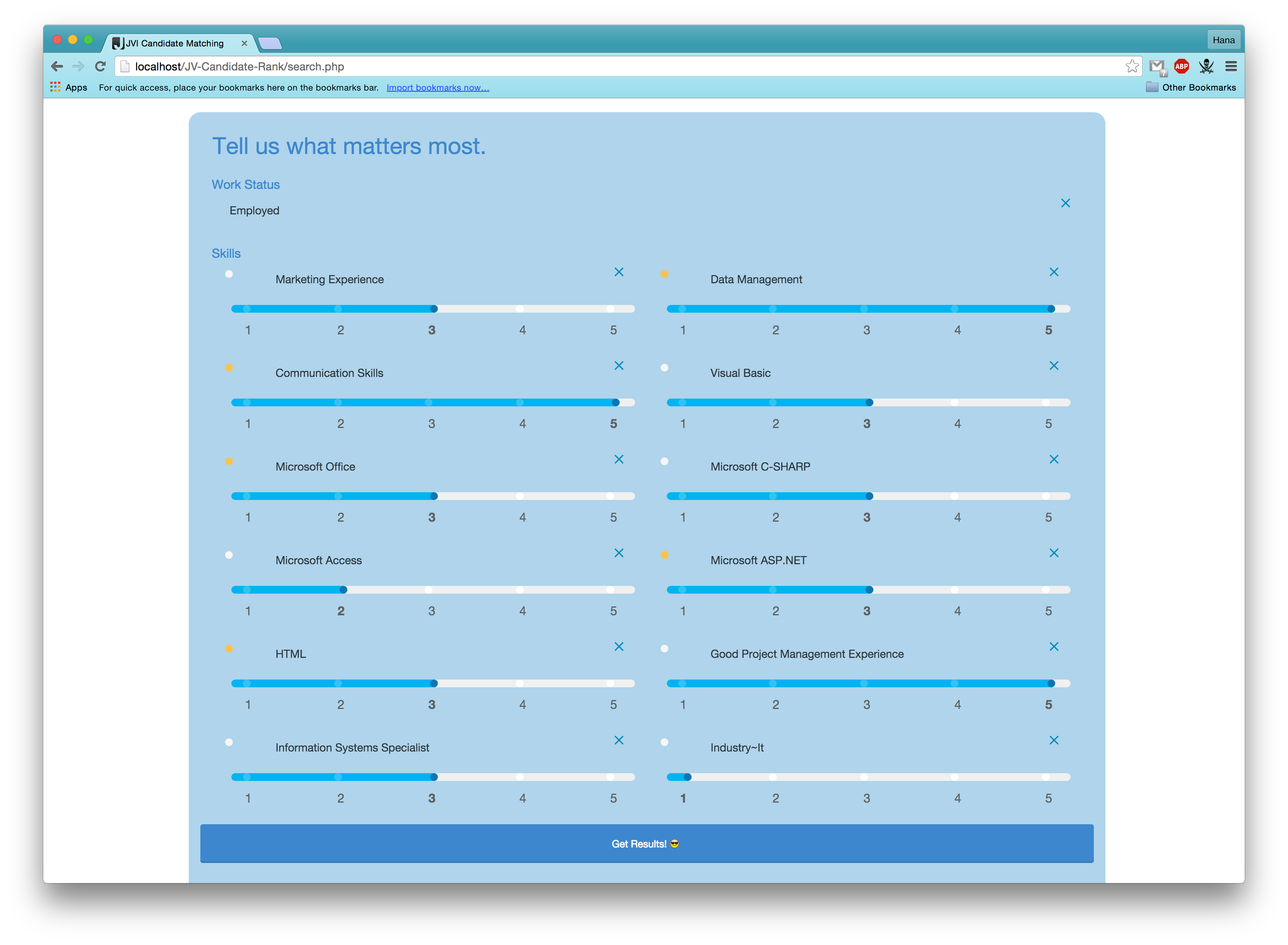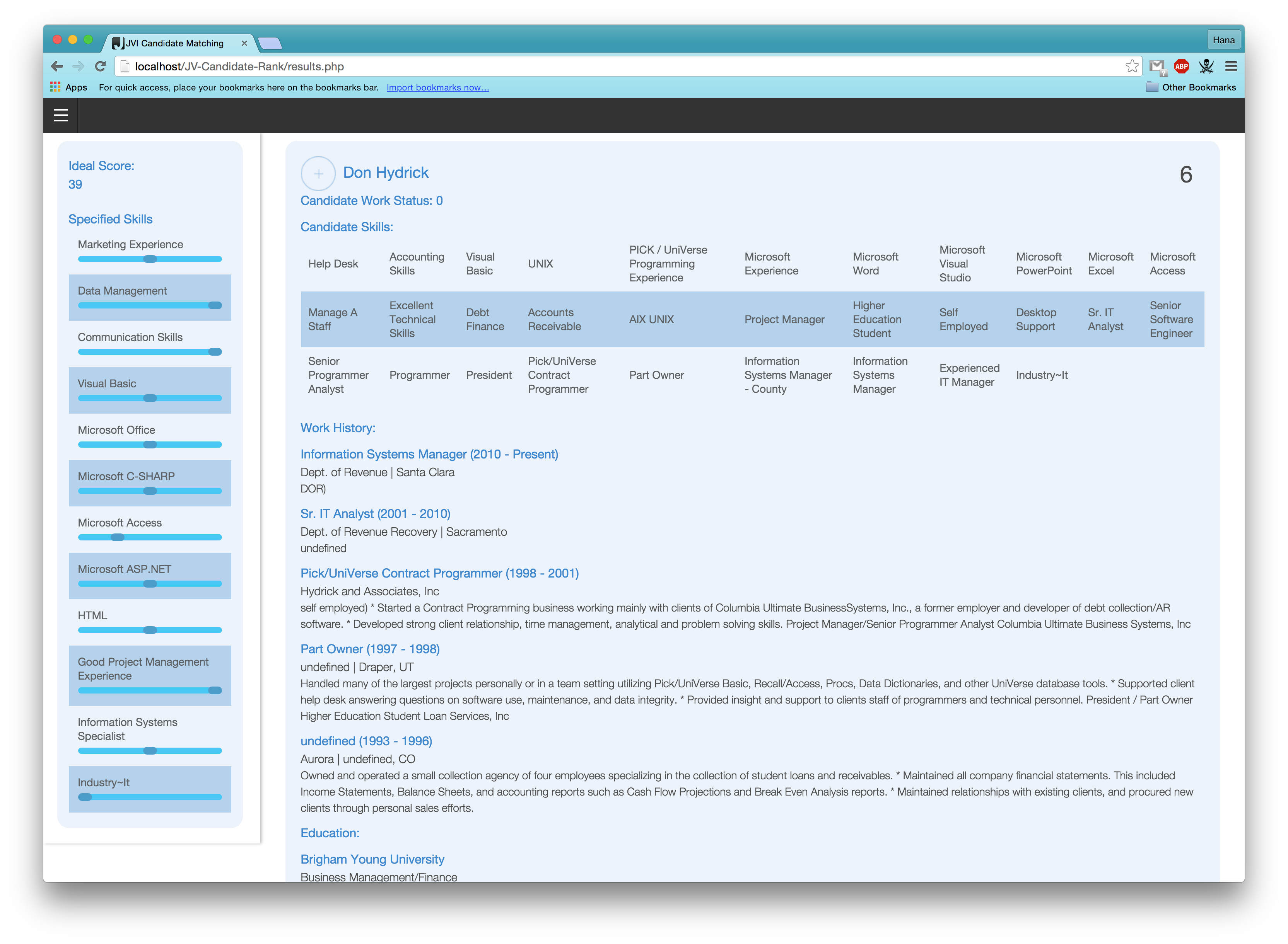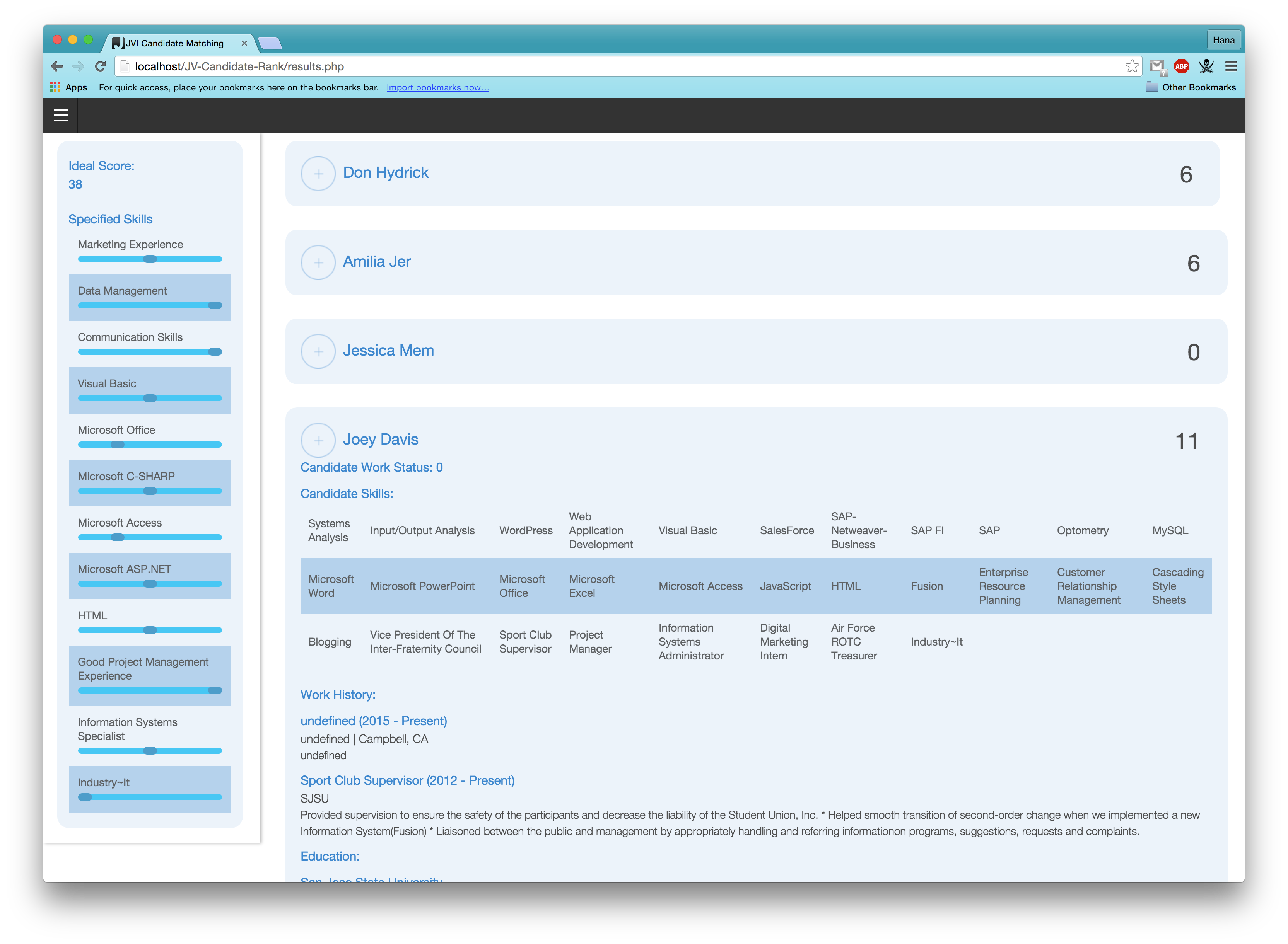 After pressing "Get Results" the algorithm is run; an ideal score is created based on the user weightages and run against other candidates. The lists and ranks of all the candidates that meet the base criteria are then presented. The result screens are shown below.